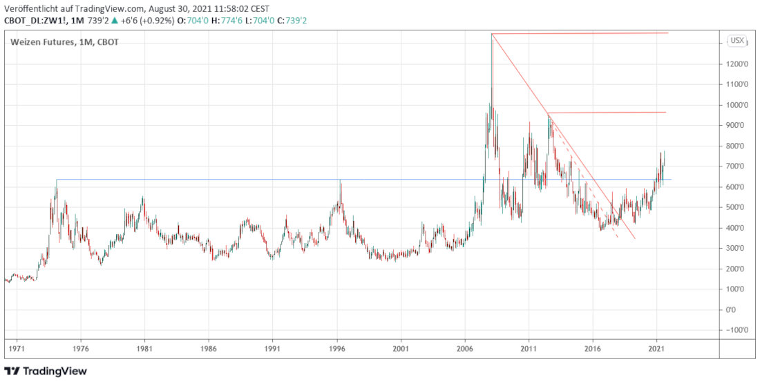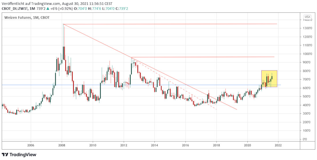 Dabei zeigt sich, dass die gesamte Bodenbildung seit Ende 2012 als Konsolidierung des Ausbruches aus seiner jahrzehntelangen Seitwärtsbewegung Mitte 2007 betrachtet werden kann. Denn scheiterte Weizen bei einem Ausbruchsversuch im April 1996 noch an seinem bis dahin gesehenen Hoch vom Februar 1974 bei 636 US-Cent je Scheffel, so unterschritt der Preis zwar nach dem Ausbruch im Juni 2007 diese Marke zwar wieder. Jedoch bildete Weizen danach über 13 Jahre einen höherliegenden verschachtelten Boden, sodass sich die Entwicklung seit dem Allzeithoch im Februar 2008 bei 1.349,40 UDS-Cent als Korrektur in einem neuen langfristigen Aufwärtstrend interpretieren lässt.