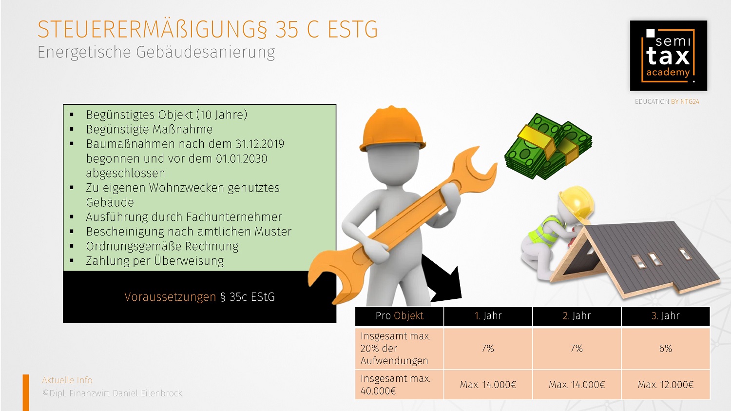 Ab dem 01.01.2020 haben Steuerpflichtige die Möglichkeit im Rahmen der Steuererklärung eine Steuerermäßigung für energetische Gebäudesanierung nach § 35c EStG zu beantragen. Die Steuerermäßigung für energetische Maßnahmen bei zu eigenen Wohnzwecken genutzten Gebäuden kann in Anspruch genommen werden, wenn die Voraussetzungen des § 35c EStG erfüllt sind.