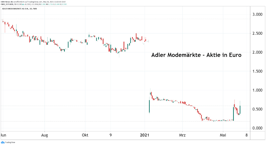 An der Tradegate Exchange legte die Aktie von Adler Modemärkte heute zeitweise über 80 % zu. Aktuell stehen die Chancen gut, dass die Firma saniert wird. Dennoch ist ein Investment mit vielen Unwägbarkeiten verbunden.