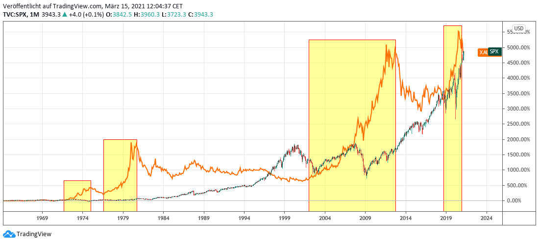 Bedeutender ist es dagegen, sich zu vergegenwärtigen, wie sich Aktien entwickelten, als Gold stärker stieg. Diese Phasen seit August 1971, also seit der Aufhebung der Goldbindung des US-Dollars, sind mit orangenen Rechtecken markiert. Sie zeigen, dass das steigende Gold über viele Jahre nicht nur ein sehr guter ,,Hedge‘‘ gegen fallende oder seitwärtslaufende Aktien in Form des S&P 500 – Index war, sondern es gerade durch Gold zu einer massiven Outperformance gegenüber einem reinen Aktienportfolio kam.