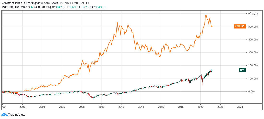 Nimmt man nun einmal die Entwicklung von Gold und des S&P 500 seit der Jahrtausendwende, so wird klar, dass Gold eine massive Besserentwicklung sah, wie Chart 2 zeigt. Die lange Phase, in der Aktien sich zwischen 2000 und 2012 nur seitwärts entwickelten, Gold sich aber verfünffachte, fallen in der Black Rock Analyse einfach unter den Tisch.
