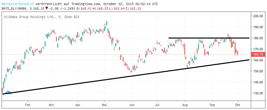 Auch wenn offensichtlich ist, dass solch ein Vorgehen vollkommen unkalkulierbare Folgen haben könnte, sorgt das natürlich trotzdem für erhebliche Unsicherheit. Mit dem Ergebnis, dass die in den USA notierten ADRs von ALIBABA an ihrer Widerstandszone bei rund 180 Dollar abprallten.