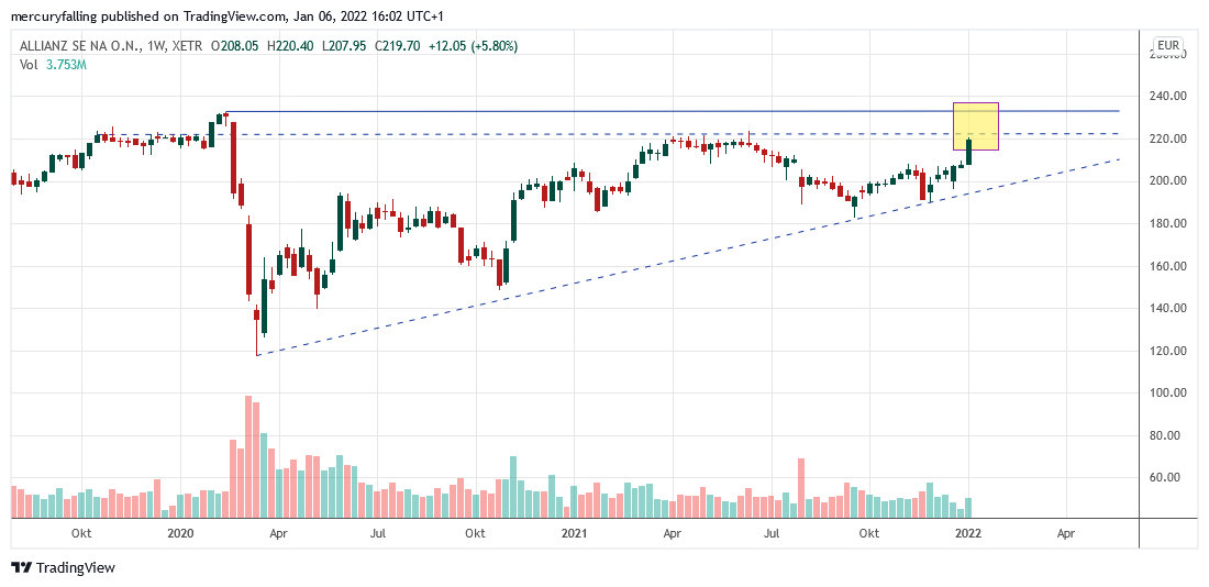 Chart 1 zeigt die Entwicklung der Allianzaktie auf Wochencandle-Basis. Dabei wird deutlich, dass der Titel nach dem Corona-Crash im März 2020 sich zwar wieder erholte, jedoch einige Mühe bekundete, das Niveau von vor der Corona-Pandemie zurückzuerobern. Nachdem die Aktie von Ende März 2021 bis Mitte Juni 2021 an dem entsprechenden Widerstand von rund 222 Euro abgeprallt war, holte sie im restlichen Jahr nochmals Schwung und steht nun erneut kurz vor dieser Widerstandszone.