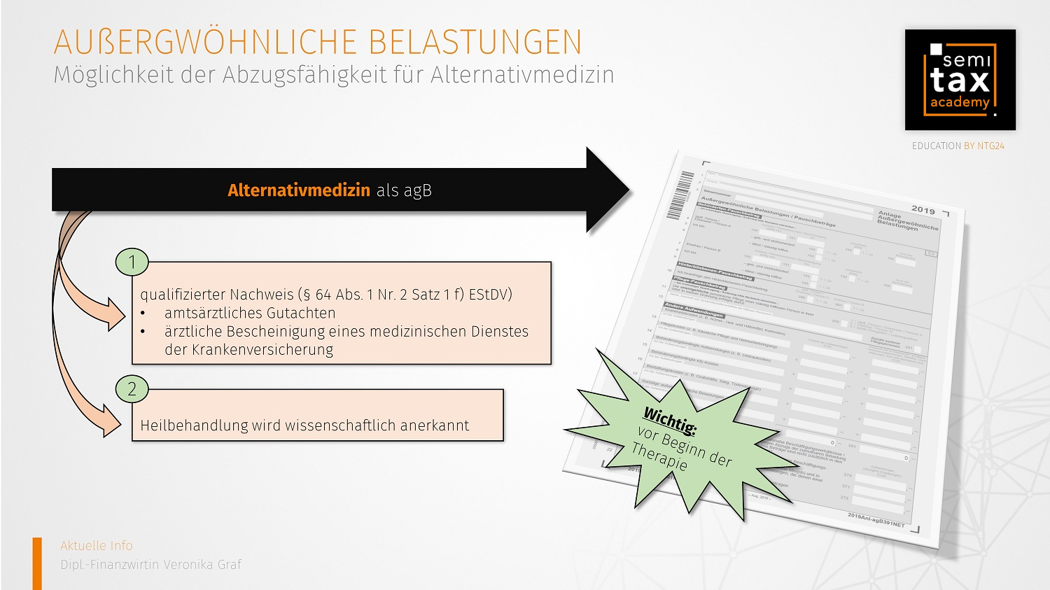 Alternative medizinische Heilbehandlungen, für die weder die Beihilfe noch die Krankenkassen die Kosten übernehmen, können steuerlich nur unter folgenden Voraussetzungen berücksichtigt werden:
