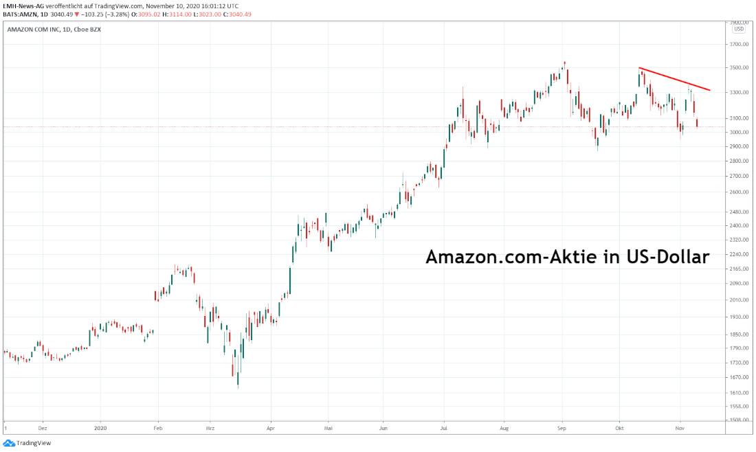 Bislang zählte die Amazon.com-Aktie (ISIN: US0231351067; WKN: 906866) zu den grössten Gewinnern unter den US-Bluechips in diesem Jahr. Notierte das Papier an Silvester 2019 lediglich bei einem Stand von 1.848 US-Dollar, so legte der Anteilsschein in der Spitze bis auf 3.552 US-Dollar zu. Getrieben wurde die Rallye vom Boom des Online-Handels, der bei Amazon.com weltweit von den Lockdowns in einigen Ländern profitierte. Zudem verzeichneten viele Händler trotz geöffneter Ladenlokale vielfach eine erheblich niedrigere Kundenfrequenz, was ebenfalls dem Marktführer aus der US-Metropole Seattle zugutekam.