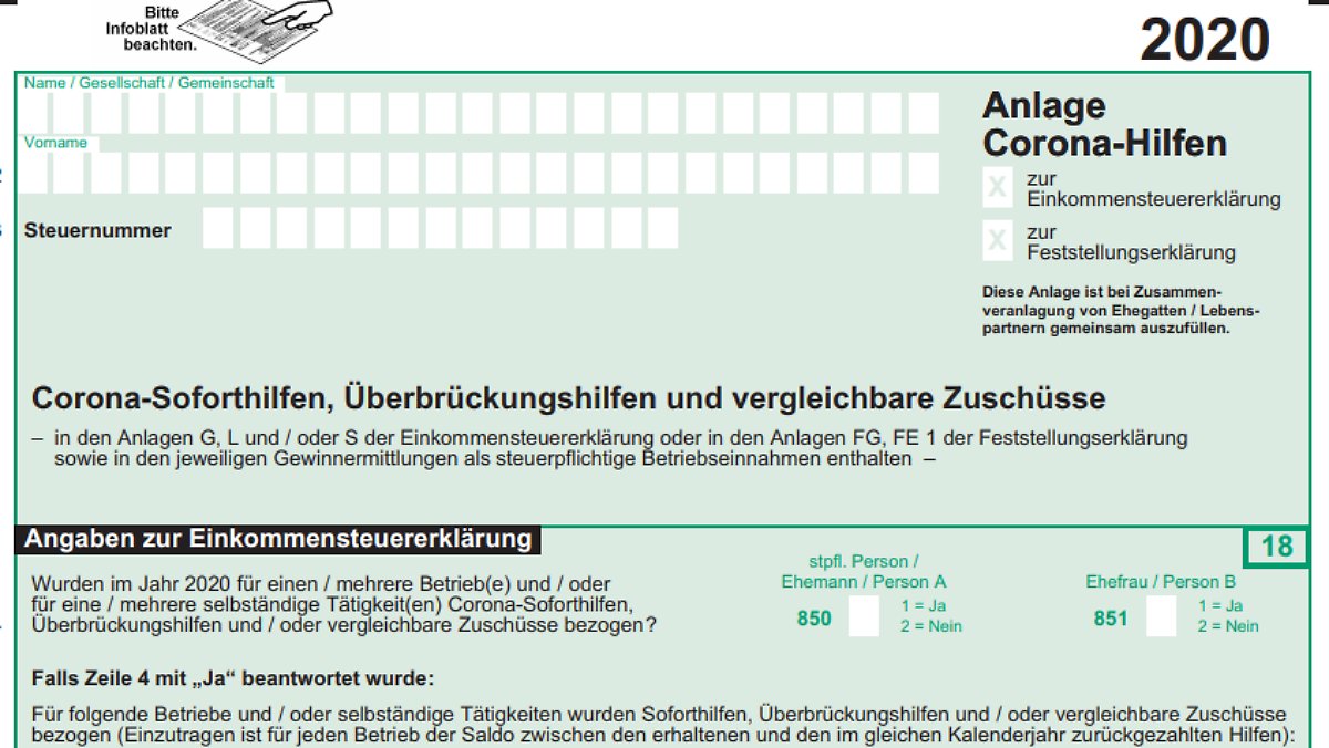Dies ruft bekanntlicherweise auch immer wieder „schwarze Schafe“ auf, welche zu Unrecht diese Fördermittel beantragen und erhalten. Um hier gegen vorzugehen, prüft das Finanzamt nun systematischer und verlangt bei Abgabe der Steuererklärung 2020 eine weitere Anlage („Corona-Hilfen“), welche verpflichtend für alle Gewerbetreibenden, Selbstständigen und Land- und Forstwirten abzugeben ist. Dementsprechend dient sie als Ergänzung der Anlagen G, S und L. Steuersoftwares wie Elster weisen den Benutzer vor Absendung auch daraufhin, um lästiges Nachfragen bei den Steuerpflichtigen zu vermeiden. Eine persönliche Eintragung ist somit gesichert.