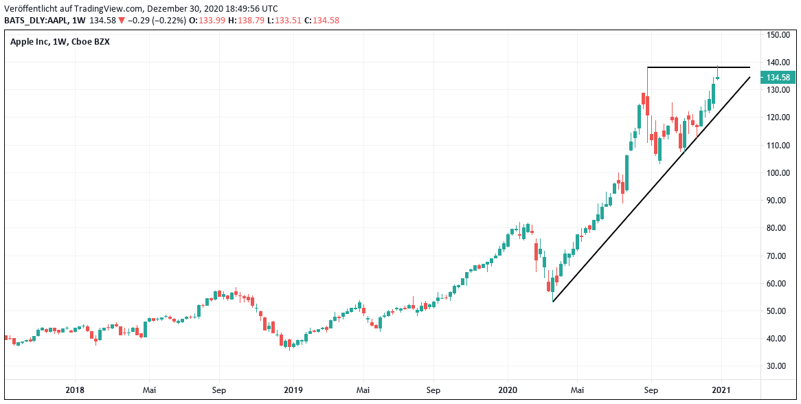 Seit Jahresanfang hat die Aktie rund 86 Prozent zugelegt und der Kurs dabei gestern einen Rekordstand von 138,79 Dollar erreicht. Dass der Titel anschließend ins Minus gerutscht ist, tut der Aktie in Anbetracht dieser starken Entwicklung nicht wirklich weh. Denn damit belegt Apple nun voraussichtlich die Position als größter Jahresgewinner im Dow Jones Industrials 30-Index, auf Platz 2 folgte zum gestrigen Dienstag Microsoft (US5949181045) mit einem Jahresplus von 42 Prozent.