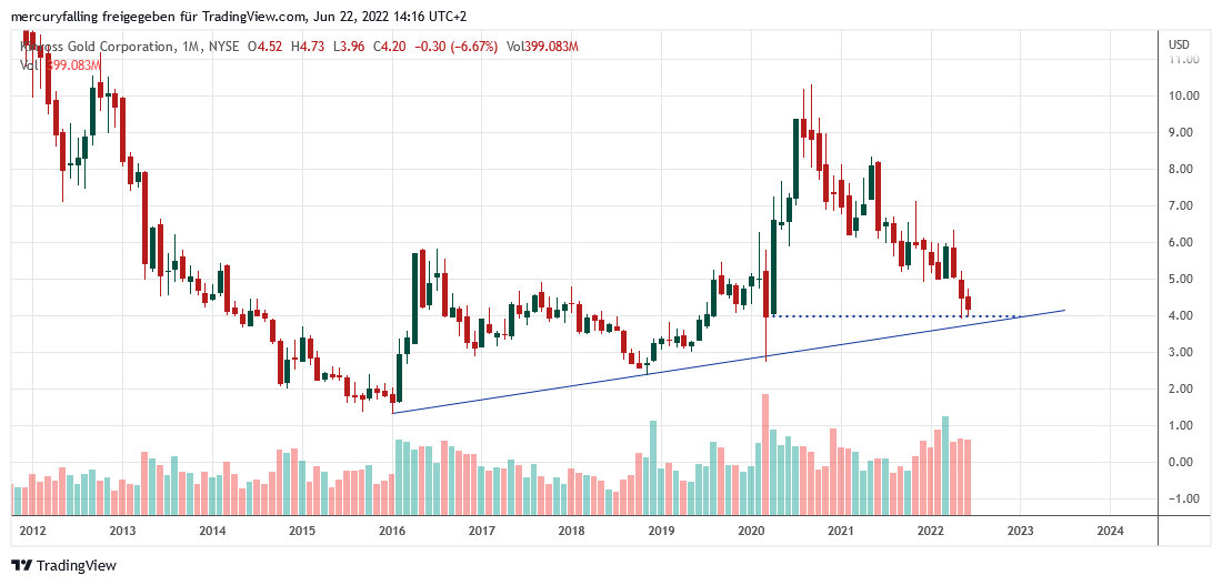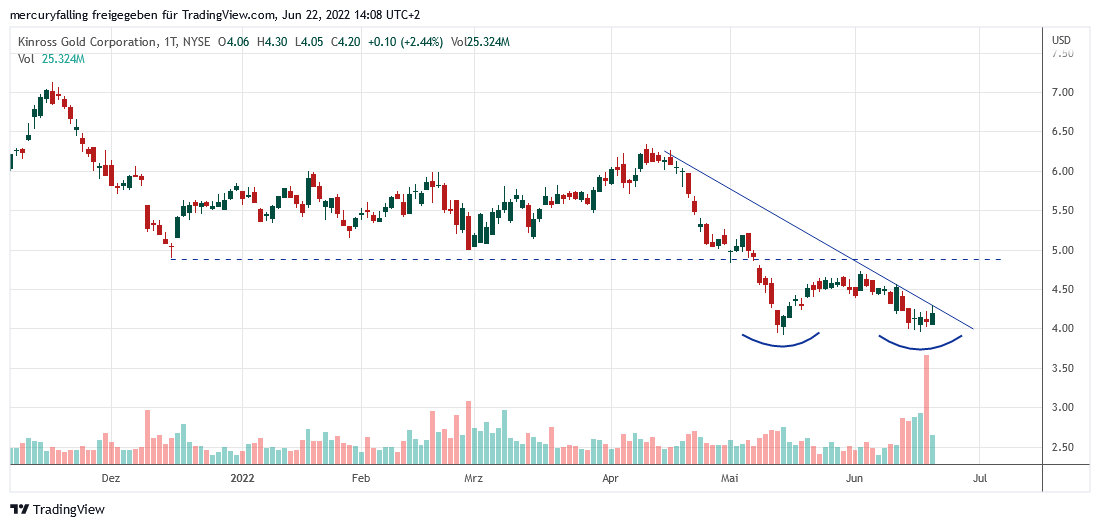 Denn in diesem wird deutlich, dass die Kinross-Aktie dabei ist, einen potenziellen Doppelboden zu bilden. Dafür sollte das Tief des ersten Teilbodens, welches vom 13.05.2022 stammt und bei 3,92 Dollar liegt, nicht unterschritten werden.