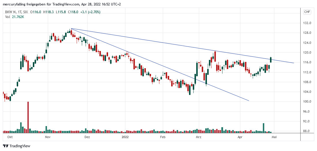 Heute nun wurde auch die flachere Abwärtstrendlinie, welche sich aus dem Zwischenhoch vom 14.03.2022 ergibt, nach oben verlassen. Damit hat die BKW-Aktie ein neues dynamisches Kaufsignal gegeben und steht zugleich vor dem Abschluss ihrer Bodenbildung.