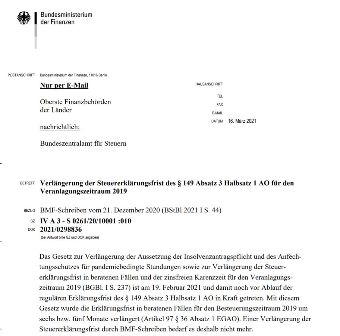 Mit Schreiben vom 16.03.2021 hat das BMF Stellung zu verlängerten Steuererklärungsfrist von Steuerberatern genommen und lediglich klargestellt, dass die Frist bereits durch das „Gesetz zur Verlängerung der Aussetzung der Insolvenzantragspflicht und des Anfechtungsschutzes für pandemiebedingte Stundungen sowie zur Verlängerung der Steuererklärungsfrist in beratenen Fällen und der zinsfreien Karenzzeit für den Veranlagungszeitraum 2019“ verlängert worden ist.