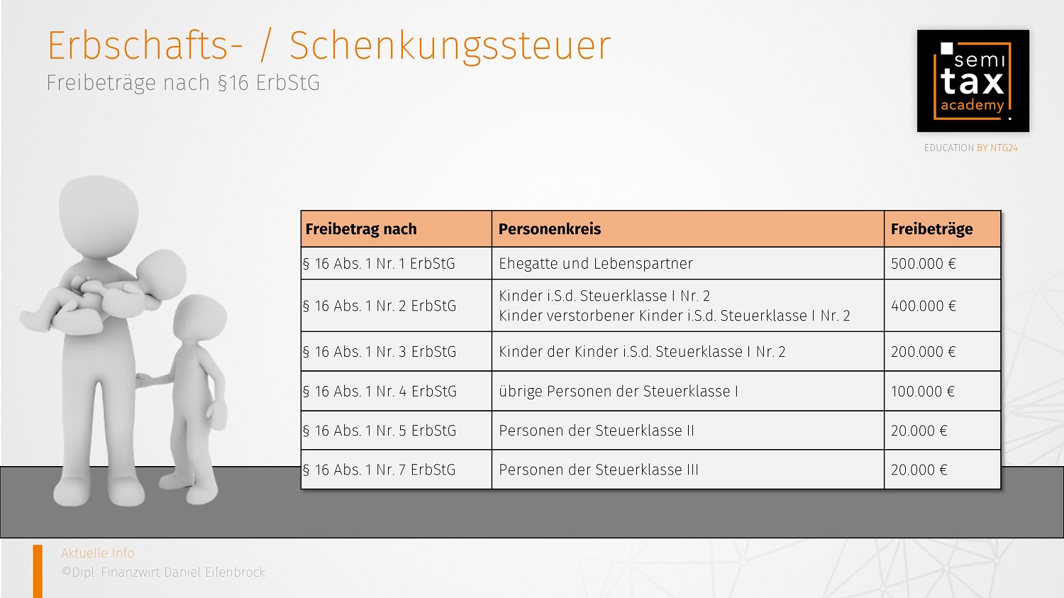 Gem. § 16 Abs. 1 ErbStG werden in den Fällen der unbeschränkten Steuerpflicht die folgenden persönlichen Freibeträge gewährt: