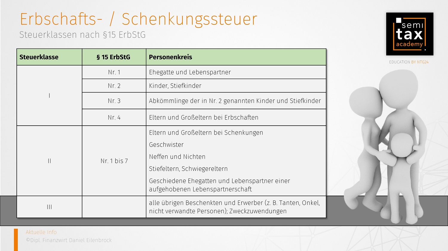 Entsprechend dem persönlichen Verhältnis des Erwerbers (Erben / Begünstigter) zum Erblasser (Verstorbenen) oder Schenker unterscheidet § 15 Erbschaftsteuergesetz (ErbStG) drei Steuerklassen. Für die Einordnung in die jeweilige Steuerklasse kommt es auf das bürgerlich-rechtliche Abstammungs- und Verwandtschaftsverhältnis zur Zeit der Entstehung der Steuer an. Im Rahmen der Steuerberechnung haben die Steuerklassen u. a. Bedeutung für die Höhe der Freibeträge nach §§ 13, 16 ErbStG sowie für den Steuersatz (§ 19 ErbStG).
