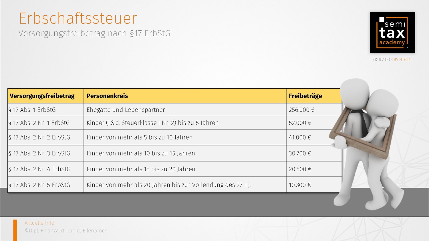 Neben den Freibeträgen nach § 16 ErbStG sind in den Fällen des Erwerbs von Todes wegen besondere Versorgungsfreibeträge für den überlebenden Ehegatten/Lebenspartner sowie für die hinterbliebenen Kinder (Stkl. I Nr. 2) zu berücksichtigen (R E 17 ErbStR):