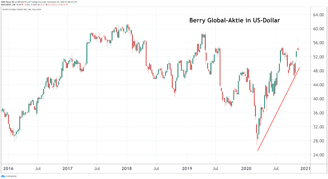 An der Wall Street zeigten sich die Händler dennoch relativ unbeeindruckt von den guten Q4-Resultaten. So pendelte das Papier zuletzt rund um die Marke von 55 US-Dollar, während insbesondere viele Technologietitel im Rahmen des jüngsten Börsenaufschwungs deutlich stärker zulegen konnten. Auch wenn die relativ defensive Verpackungsbranche derzeit nicht im Fokus der Investoren steht, so bietet die Berry Global-Aktie, die sich auch im konservativen Musterdepot des Zürcher Trends befindet, weiterhin ein sehr attraktives Chance-Risiko-Verhältnis.