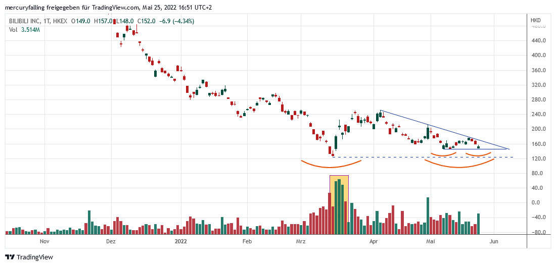 Die Aktie von Bilibili hat durch Anzeichen, dass die chinesische Regierung den Markt nicht ,,totreguliert‘‘, spürbar an charttechnischer Kraft gewonnen. Dies bedeutet, dass die Aktie seit dem Jahrestief vom 15.03.2022 bei 125 HKD deutliche Ansätze einer Bodenbildung zeigt.