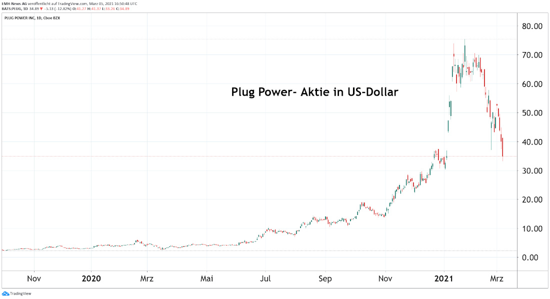 In den vergangenen Wochen hatten wir mehrfach und konsequent auf eine Überbewertung und massive Blasenbildung bei den Aktien von Nel ASA (ISIN: NO0010081235; WKN: A0B733), Plug Power (ISIN: US72919P2020; WKN: A1JA81) und Ballard Power (ISIN: CA0585861085; ISIN: A0RENB) hingewiesen. Zudem merkten wir unter anderem in einem Artikel vom 23.02.2021 an, dass alle drei Werte aus technischer Sicht massiv angeschlagen sind. Mittlerweile haben alle Papiere massiv an Wert verloren, wobei der Verkaufsdruck auch heute unvermindert anhielt. Gleichzeitig weisen alle Titel ein hohes Handelsvolumen auf, was zeigt, dass diese Bewegung alles andere als kurzfristig ist.