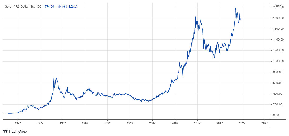 Das Timing der brasilianischen Zentralbank hat passt zur Koinzidenz. Denn wie ein Blick auf Chart 1 zeigt, bietet ein Blick zurück auf die Entwicklung des Goldpreises in den 50 Jahren nach der Aufhebung der Goldbindung des US-Dollars am 15.08.1971 viele Aufhänger für die Frage, welche Reservepolitik eine Zentralbank anstreben sollte.