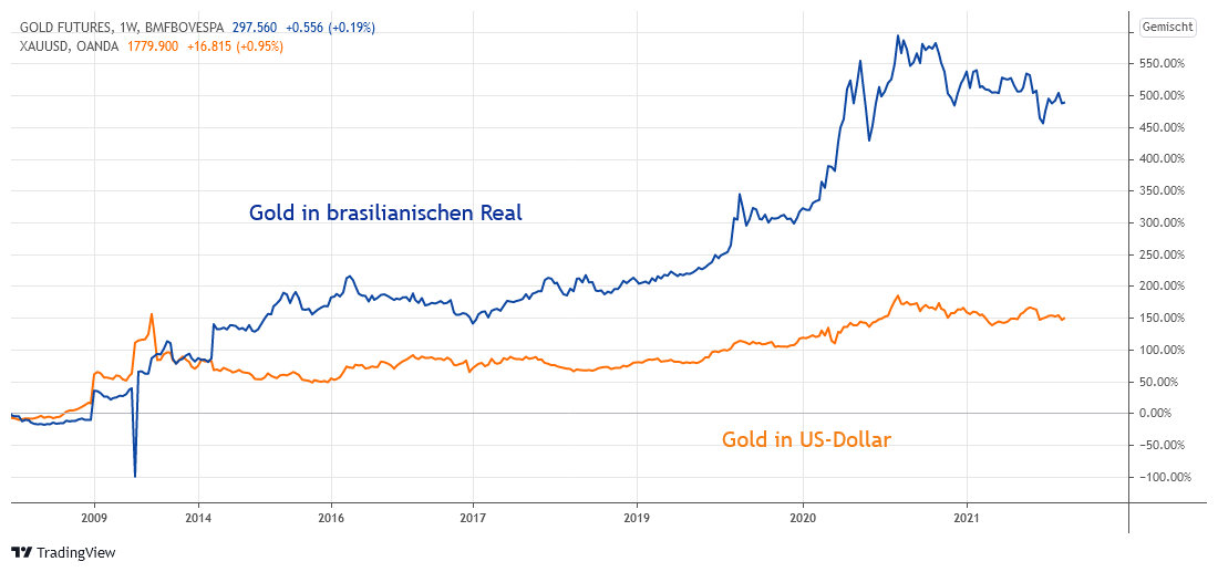 Dies bedeutet aber auch, dass der Goldpreis in brasilianischen Reals unabhängig vom Goldpreis um diese Abwertung teurer wird.