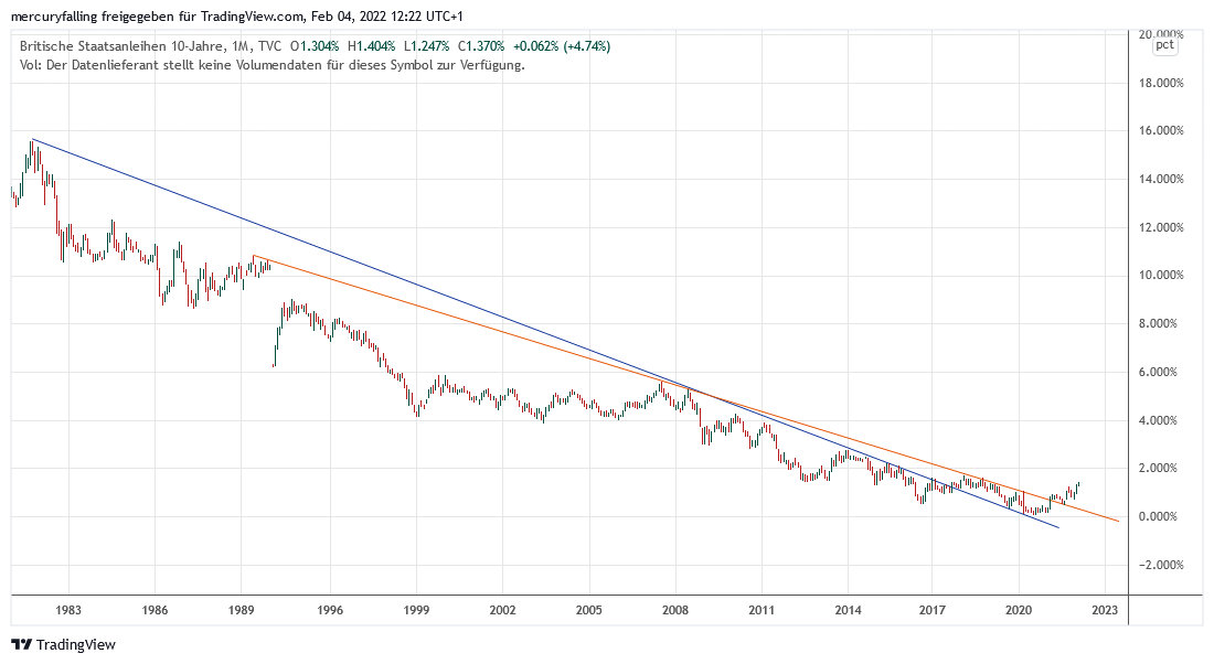 der seit September 1981 laufende Abwärtstrend, der seinen Ausgangspunkt bei einer Rendite von 15,56 % hatte, bereits im Jahresverlauf des Jahres 2017 erstmals gebrochen wurde. Danach setzte die Rendite noch zweimal, im September 2019 in der Repo-Krise, und im März 2020, im Corona-Crash, von oben auf die bereits überwundene langfristige Abwärtstrend-Linie auf und bestätigte diese damit.