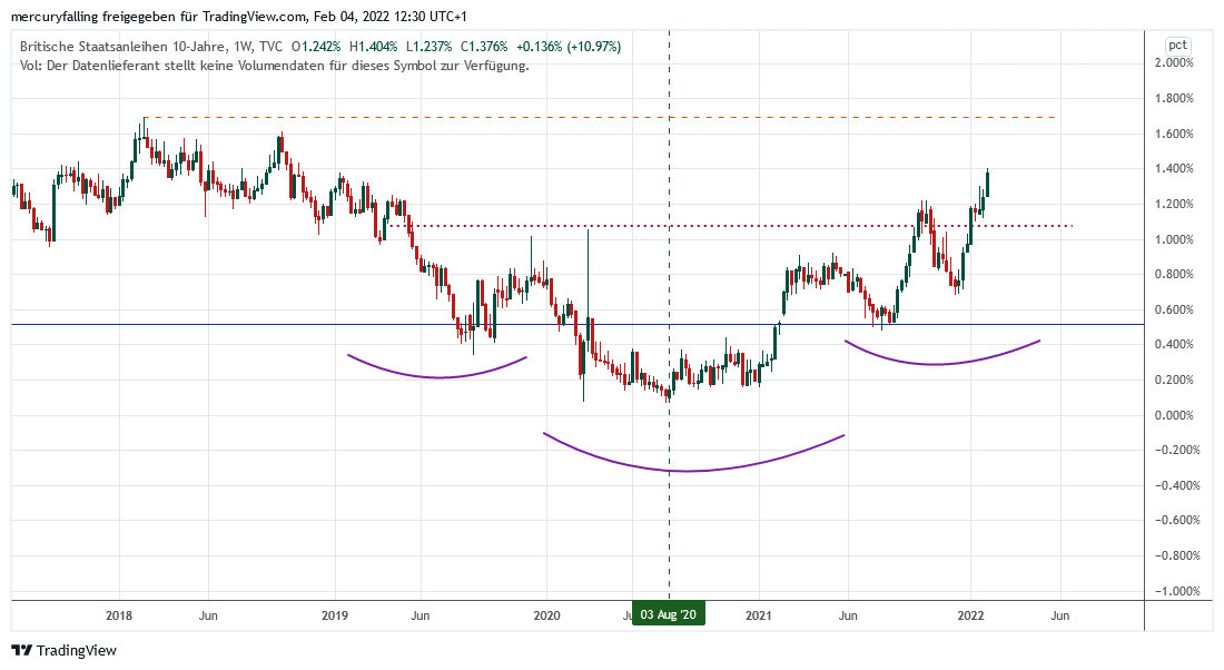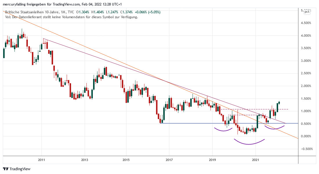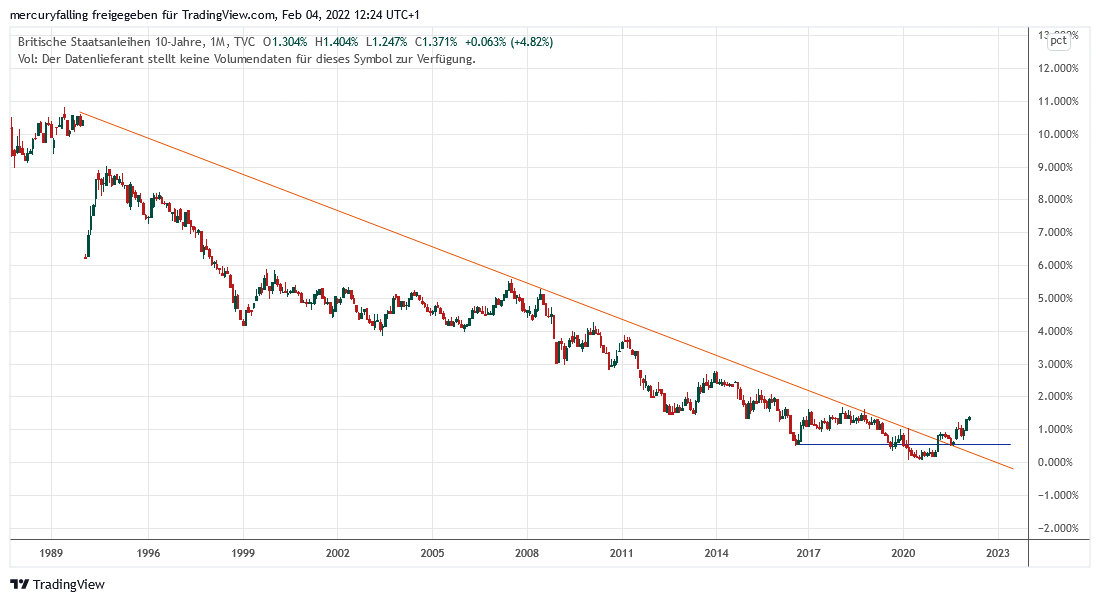 Ein Blick auf die Entwicklung der Rendite 10-jähriger britischer Staatsanleihen zeigt zunächst, dass