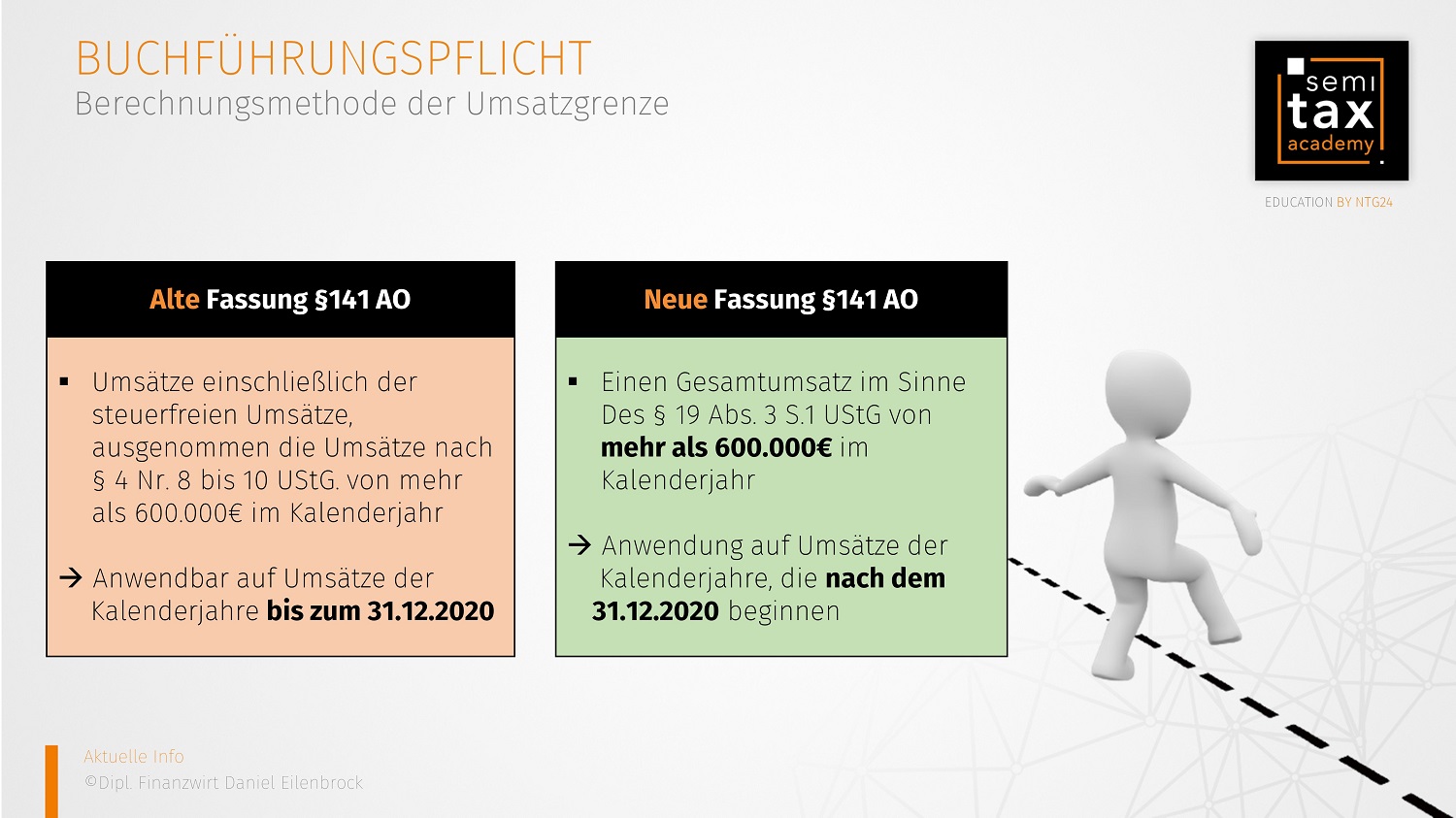 Die neue Fassung des § 141 Abs.1 Nr.1 AO ist auf Kalenderjahre anzuwenden, die nach dem 31.12.2020 beginnen.