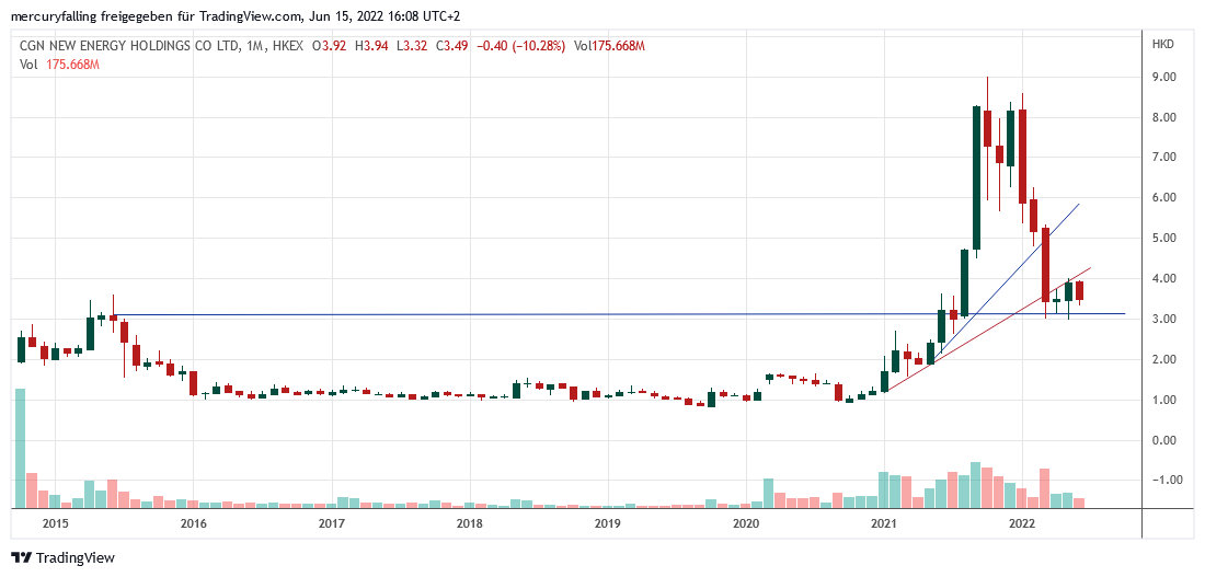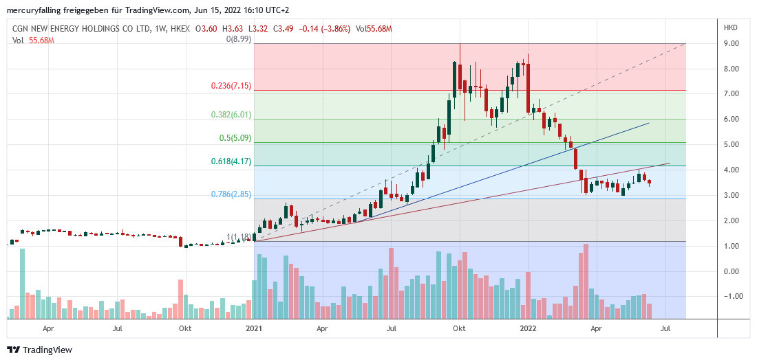 Die Aktie des in Hongkong domizilierten Stromproduzenten CGN New Energy gab im Zuge neuer Lockdown-Maßnahmen Chinas im Frühjahr 2022 deutlich nach. Das bisherige Jahrestief wurde am 10.05.2022 erreicht. Der Titel konsolidiert seit dem Kursrutsch ab Mitte März seither und könnte auf dem aktuellen Kursniveau einen Boden bilden. Die Aktie hat weiter Kurspotenzial.