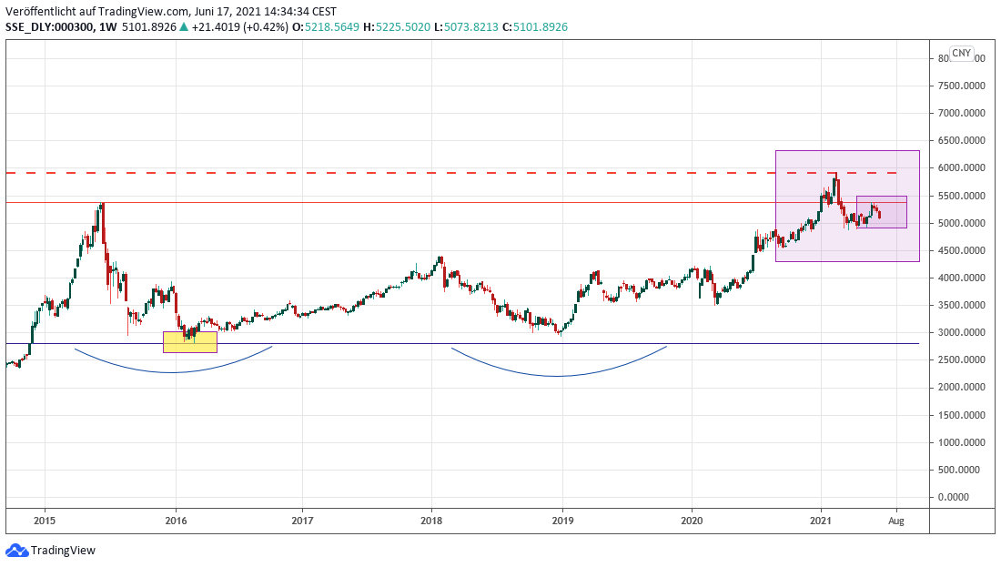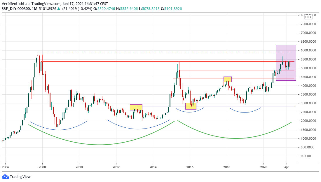 Der chinesische Aktienmarkt hat eine mehr als 12 Jahre andauernde Konsolidierung seines ersten explosiven Anstieges, der fast mit einer Kursversechsfachung einherging, hinter sich. Am 18.02.2021 markierte der CSI 300 bereits ein neues Allzeithoch, welches aber bislang nicht auf Wochen- und Monatsbasis bestätigt wurden.