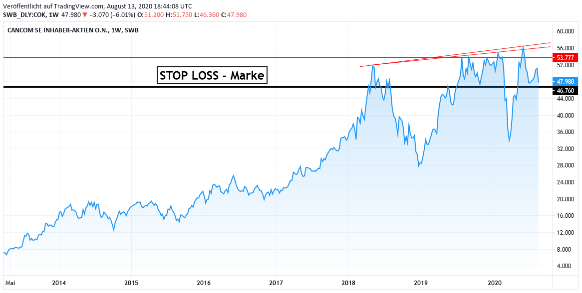 Nach der schwachen Halbjahresbilanz hat sich zudem die bereits ausgeprägte Widerstandzone oberhalb von 55 Euro nun ohne Frage nochmals massiv verfestigt. Die mit einem KGV (2020e) von 40 und (2021e) von 30 in unseren Augen fundamentalanalytisch nun auch kaum mehr attraktiv bewertete Aktie stellen wir in unserem Strategiedepot AKTIEN SPEKULATIV daher (immer noch mit einem heutigen Kursgewinn von + 11,9 %) zur morgigen Börseneröffnung am 14.08. zum Verkauf.
