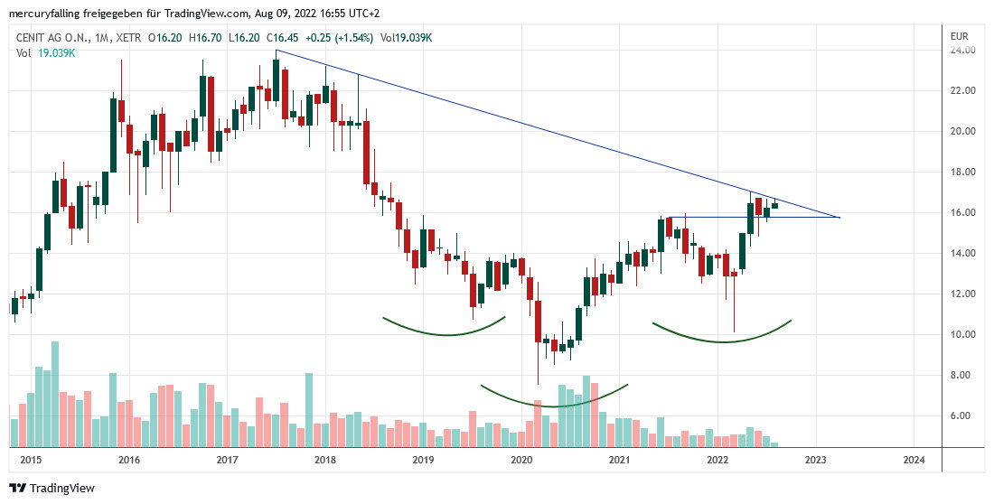 Die Aktie von Cenit hat in den vergangenen Wochen ihren Ausbruch über den Widerstand bei 15,75 Euro, dem oberen Monatscandle vom Juni 2021, konsolidiert und stieß dabei an ihren seit dem Allzeithoch im Juli 2017 laufenden Abwärtstrend von unten an. Seither bewegt sich der Titel quasi in einer enger werdenden Handelsspanne, die von unter von der Unterstützung bei 15,75 Euro auf Monatsbasis und von oben von der fallenden Abwärtstrend-Linie begrenzt wird.