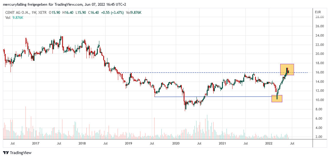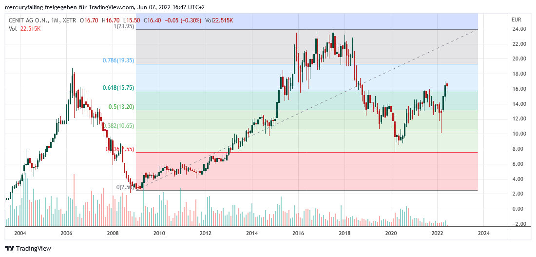 Die Aktie der Cenit AG hat eine volatile Bodenbildung hinter sich, die im Frühjahr nach dem Einmarsch Russlands in die Ukraine und einer anschließenden Akquisition ihren vorläufigen Abschluss fand und auf Monatsschlusskurs-Basis per Ende Mai 2022 bereits bestätigt wurde. Dabei hat die Aktie zuvor eine kleine ,,Bärenfalle‘‘ gebildet. Mittelfristig ist deshalb mit steigenden Kursen zu rechnen.
