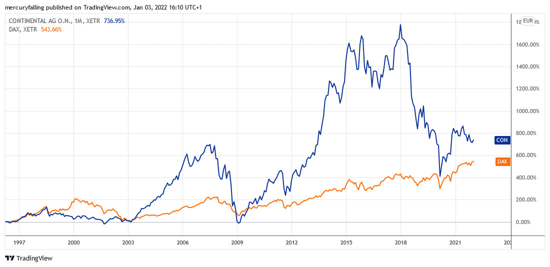 Welche Achterbahnfahrt die Aktionäre mit den Hannoveranern in den letzten 25 Jahren mitmachten, zeigt Chart 1, der die Aktie von Continental mit ihrem Index, dem DAX, vergleicht. Dabei wird deutlich, dass die Aktie seit dem Allzeithoch im Januar 2018 bis zum Corona-Crash im März 2020 praktisch alle relativen Gewinne gegenüber dem Index wieder abgeben musste.