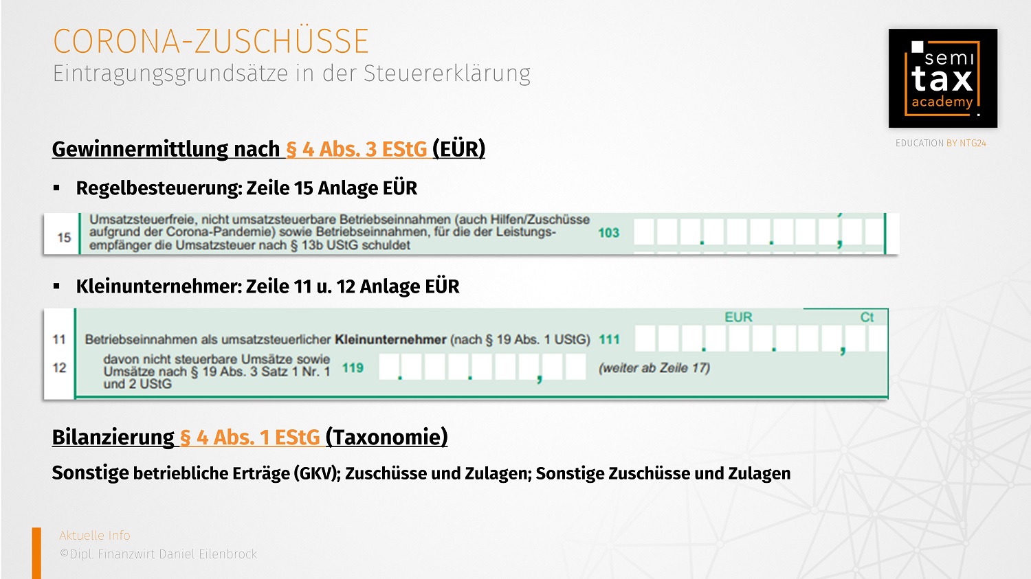 Neben der Erfassung als Betriebseinnahme ist zusätzlich die Anlage Corona-Hilfe auszufüllen. In dieser Anlage sind ausführliche Angaben zu machen, ob ein Corona-Zuschuss in Anspruch genommen wurde. Die Finanzverwaltung hat zur Vereinheitlichung der Eintragung von Corona-Zuschüssen in der Gewinnermittlung Grundsätze aufgestellt. Diese sollen Rückfragen vermeiden und zur Vereinfachung des Verfahrens dienen.