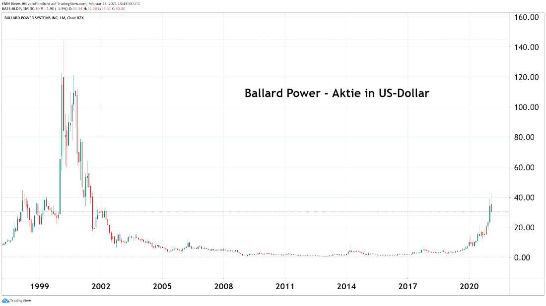Auch wenn die Unternehmen über vergleichsweise gute Zukunftsperspektiven verfügen, so sollte das Risiko bei einer Anlage in diese Trendwerte niemals unterschätzt werden. Denn nach den massiven Kursanstiegen in den Vorwochen sind die entsprechenden Unternehmen aus fundamentaler Sicht um ein Vielfaches überbewertet. Wo die Werte jetzt einen konkreten tragfähigen Boden herausbilden, ist derzeit kaum seriös zu prognostizieren. Allerdings wird am langfristigen Chart von Ballard Power deutlich, wie hoch die Fallhöhe sein kann.