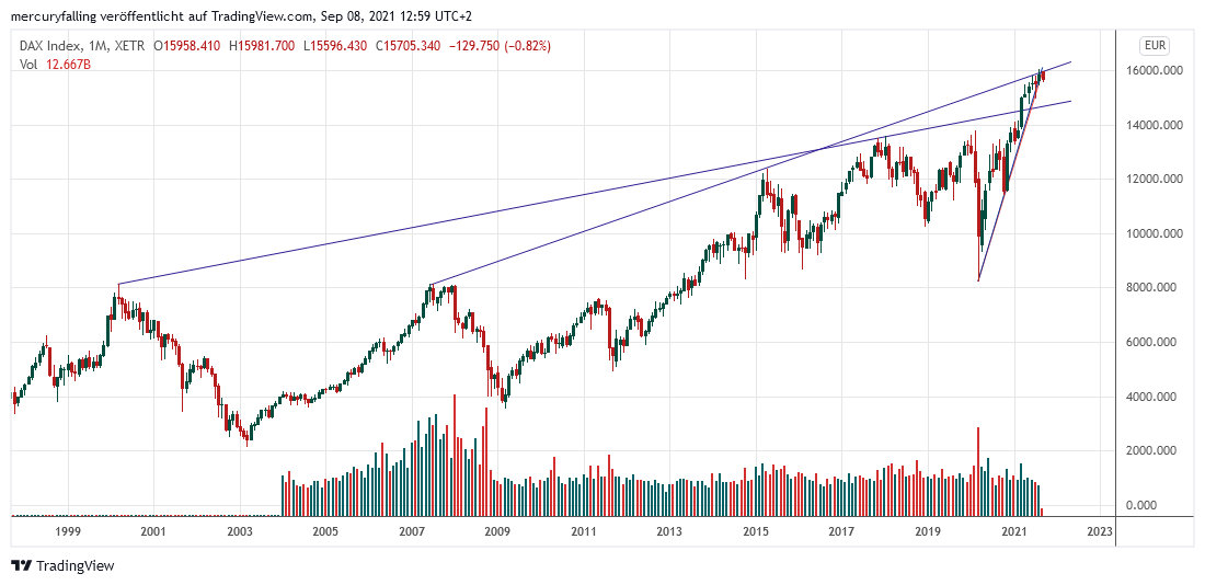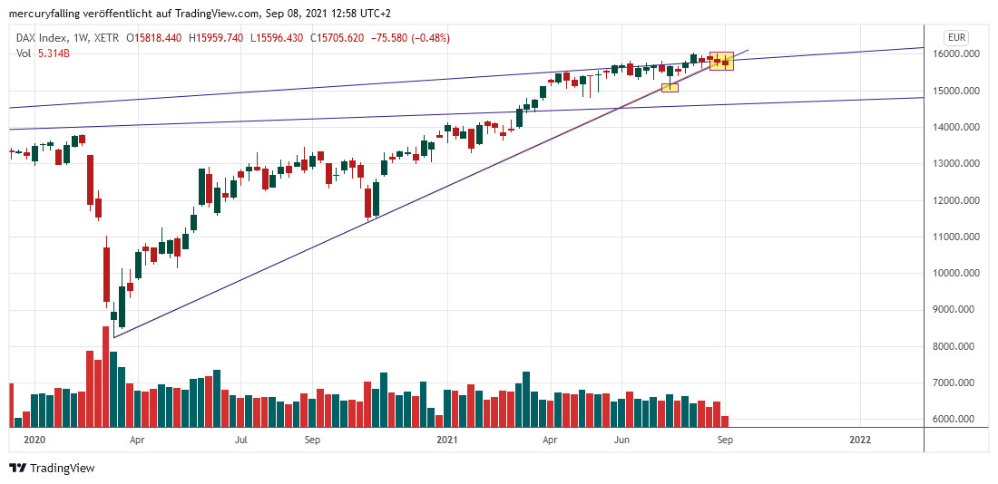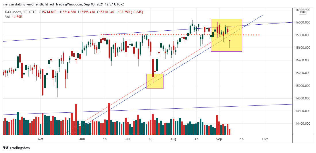Bereits am 19.07.2021 hatte der DAX dabei seine steilere mittelfristige Aufwärtstrend-Linie unterschritten, wenngleich nicht auf Tagesschlusskurs-Basis. Am 03.09.2021 folgte dann die nächste Verletzung.