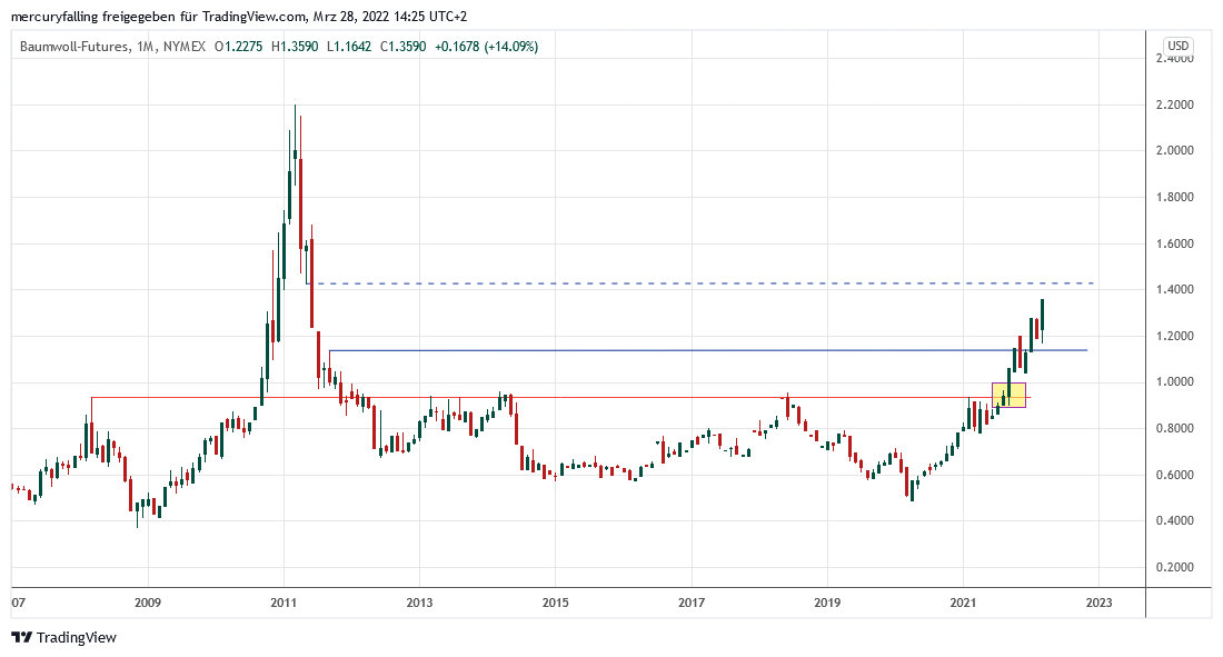 Wie ein Blick auf die langfristige Entwicklung des NYMEX-Baumwoll-Futures zeigt, ist der Preis mit aktuell 1,3590 US-Dollar mit viel Schwung auf ein neues 11-Jahres-Hoch gestiegen.