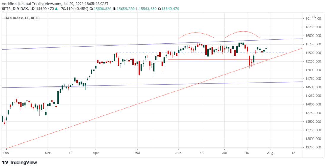 Die deutschen Aktien profitierten heute von der aus den USA kommenden anhaltend expansiven Ausrichtung der Notenbank FED sowie den insgesamt positiv aufgenommenen Quartalszahlen der Unternehmen. Zu Handelsschluss lag der DAX schließlich 70 Zähler im Plus bei 15.640 Punkten.