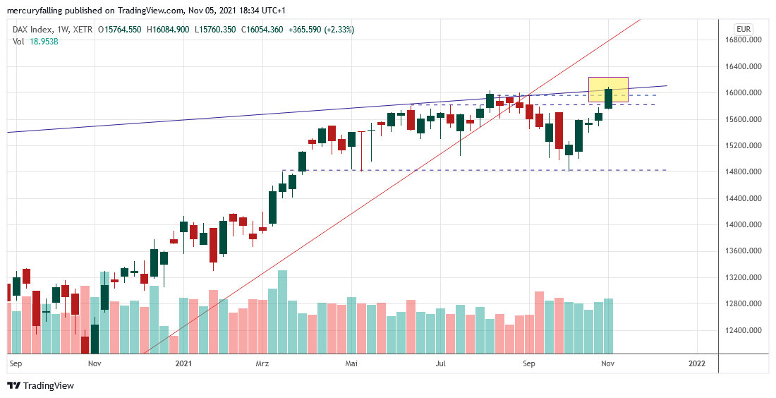 Der DAX hat mit seinem heutigen Anstieg das Allzeithoch und damit die Fortsetzung des Aufwärtstrends auch Wochenschlusskurs-Basis bestätigt. Zu Handelsschluss lag er 25 Zähler im Plus bei 16.054 Punkten.