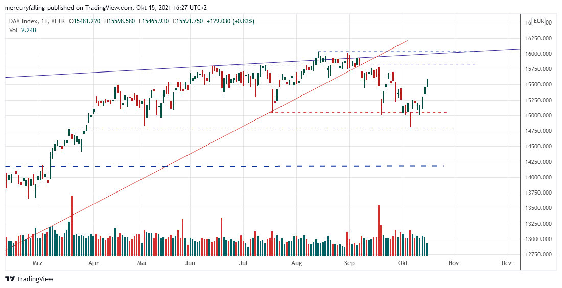 Die deutschen Aktien können heute bis zum späten Nachmittagshandel weiter zulegen. Der DAX gewinnt aktuell 115 Zähler auf 15.577 Punkte. Charttechnisch nutzt er dabei seine große Handelsspanne, die er in der vergangenen Woche auf der Unterseite getestet hatte. Die Schnelligkeit, mit der der DAX diese Spannweite derzeit überwindet, lässt einen Test der oberen Widerstandslinie bei rund 15.800 Punkten in der nächsten Woche erwarten.