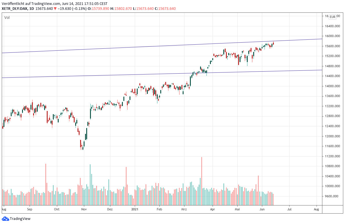 Heute schloss er nach einem Eröffnungs-Gap nach oben dann im Zuge der schwächeren Wall Street 20 Punkte tiefer bei 15.674 Zählern. In New York liegt der DJIA aktuell 221 Zähler tiefer bei 34.259 Punkten, während der Nasdaq 100 44 Zähler auf 14.042 Punkte zulegen kann. Die Marktteilnehmer warten auf das FED-Meeting in dieser Woche, nachdem das EZB-Meeting in der vergangenen Woche ein geldpolitischer ,,nothing burger‘‘ gewesen sein dürfte.