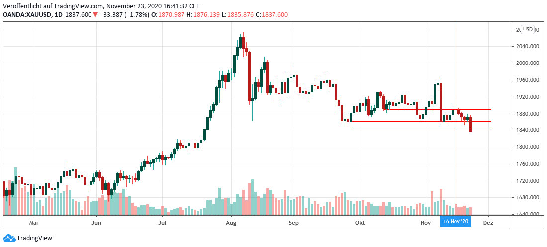 Der Goldpreis gibt derzeit ebenfalls nach und verliert 32,12 Dollar bzw. 1,72 % auf 1.838,87 Dollar. Ein Blick auf den kurzfristigen Kursverlauf zeigt, dass der Goldpreis damit eine kurzfristige Unterstützung unterschritten hat. Damit dürfte die aktuelle Schwäche wahrscheinlich noch einige Zeit anhalten.
