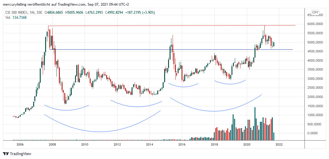 Aus dieser Perspektive hält sich die Korrektur seit Februar 2021 bislang an ein Drehbuch, in dem der untere Rand der Konsolidierungsspanne aus dem November 2007 stammt und das erwarten lässt, dass der CSI300 in nächster Zeit einen neuen Anlauf auf das bisherige Allzeithoch vom Februar 2021 macht. Denn mit diesem Hoch bei 5.930,91 Punkten war bereits im Februar dieses Jahres das alte Allzeithoch vom Oktober 2007 bei 5.891,72 Punkten überwunden worden.