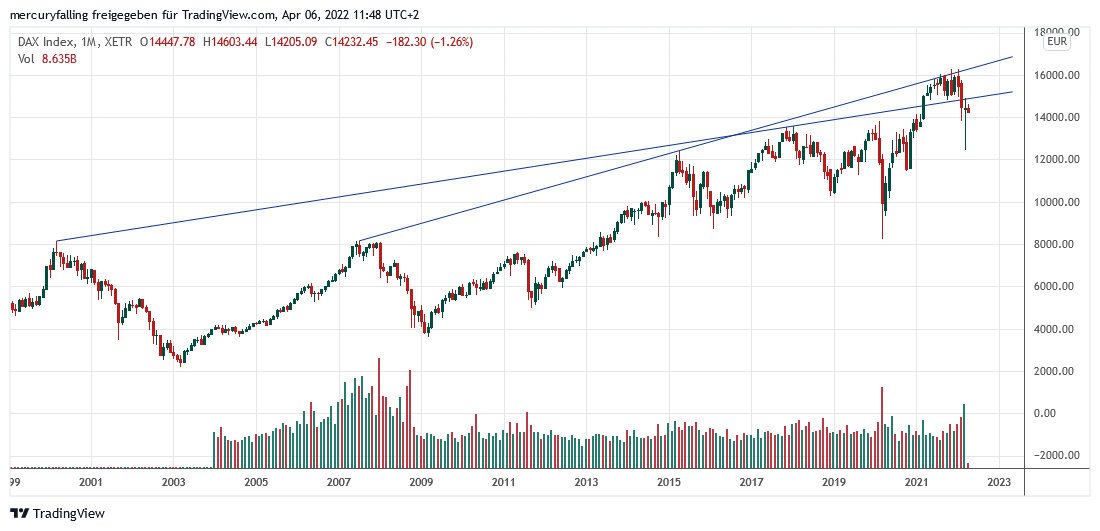 Denn er war seinem Ausbruch über die flachere, seit März 2000 laufende obere Trendlinie, zwar bis an seine steilere, seit Juli 2007 laufende Trendlinie gekommen, konnte diese aber auf Monatsschlusskurs-Basis in der Folge nicht überwinden und rutschte dann, wie untenstehende Grafik zeigt, mit dem Einmarsch Russlands in die Ukraine, sogar wieder unter die flachere Trendlinie ab.