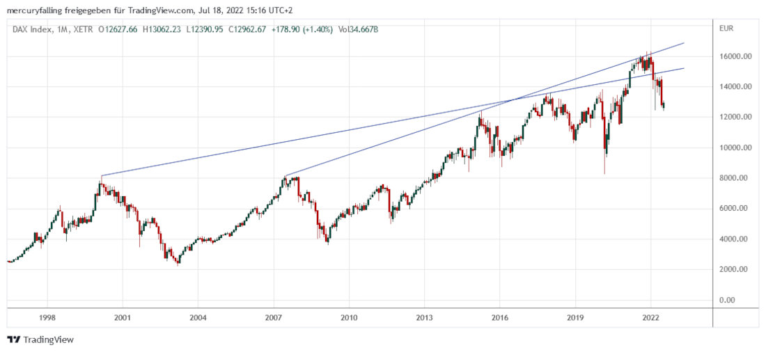 Mit dem erneuten Rutsch vom Februar 2022 im Zuge des Einmarsches Russlands in die Ukraine hat der DAX dann auch seine flachere Aufwärtstrend-Linie, die ihren Ausgangspunkt im Neue-Markt-Hoch vom März 2000 hat, unterschritten. Dabei versuchte der Index in den Wochen zwischen Ende Februar 2022 und Anfang Juni 2022 zwar eine Gegenbewegung. Diese wurde allerdings mit dem Monatscandle Juni 2022 erfolglos beendet.