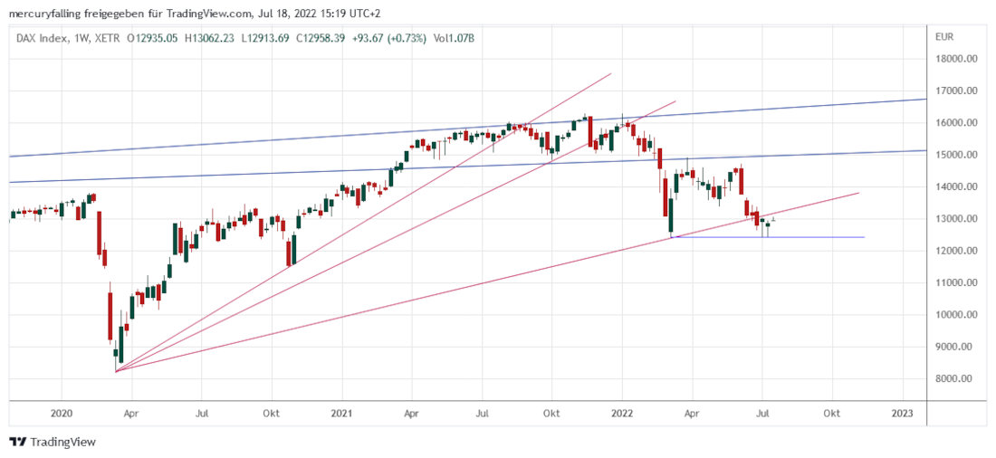 Dabei wird auch deutlich, dass der flachste Aufwärtstrend Ende Juni 2022 unterschritten wurde, die statische Unterstützung des Zwischentiefs vom 07.03.2022 bei 12.439 Punkten jedoch nur 2 Mal knapp unterschritten wurde.