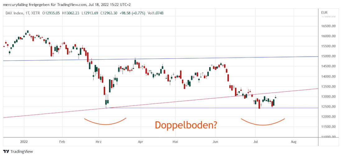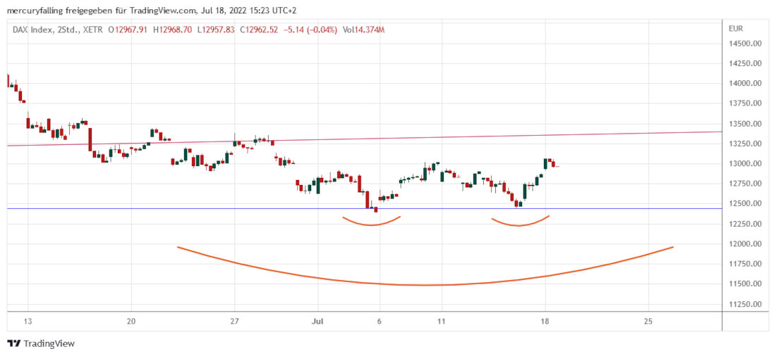 Dort zeigt sich, dass das Tief vom 14.07.2022 höher liegt als jenes vom 05.07.2022, eine wichtige Voraussetzung für einen glaubhaften kurzfristigen Doppelboden. Zudem wird deutlich, dass der DAX aktuell mit der Nackenlinie des kleinen Doppelbodens kämpft. Sollte dieser überwunden werden und der DAX nicht mehr unter den Bereich unterhalb von 12.620 Punkten fallen, verstärkt das Muster auf Stundenbasis die Mustervermutung auf Tages-Basis.