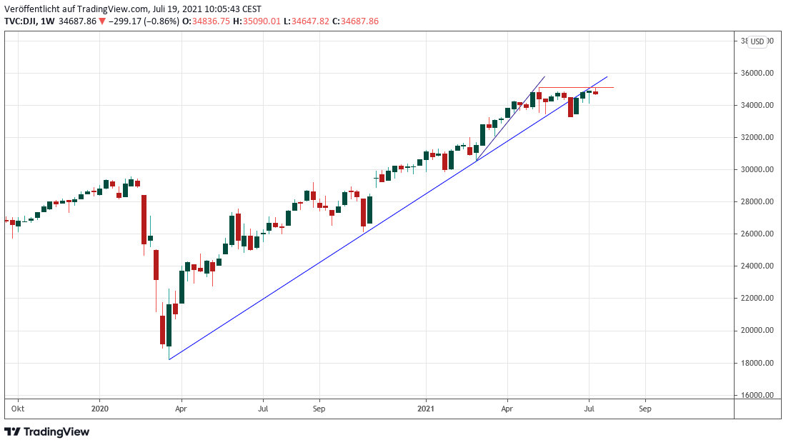 Seither hat sich der Dow Jones zwar wieder berappelt, konnte dabei aber weder diese Aufwärtstrend-Linie zurückerobern noch ein neues Allzeithoch markieren. Stattdessen hat er erneut nach unten abgedreht.