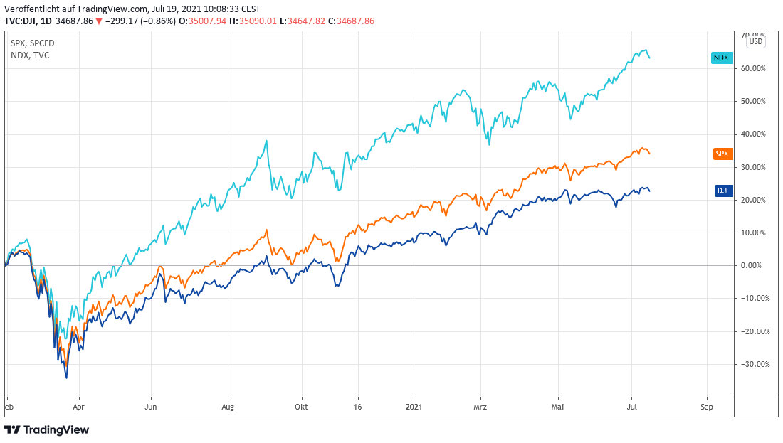 Vergleicht man zudem die Entwicklung des DJIA mit jener des Nasdaq 100 und des S&P 500, so zeigt sich eine mehr oder weniger deutliche Under-Performance des Dow Jones seit dem Corona-Crash im März 2020. Diese zeigt Chart 3.