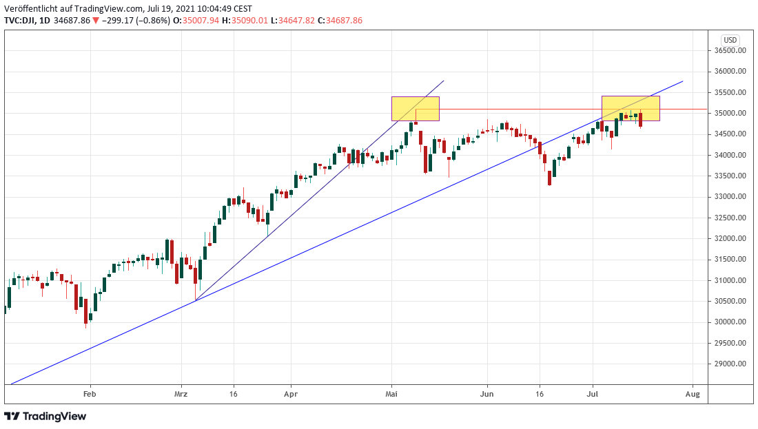 Chart 2 zeigt die Entwicklung auf Tagescandle-Basis. Dabei zeigt das linke gelbe Rechteck nicht nur das bisherige Allzeithoch bei 35.091,56 Punkten, sondern auch, dass im Zuge dieser Aufwärtsbewegung bis zum 10.05.2021 der DJIA bereits von unten an einer steileren kürzeren Aufwärtstrend-Linie abgeprallt ist. Gleiches hat sich nun mit der bereits erwähnten, mittelfristigen Aufwärtstrend-Linie wiederholt, welches mit dem rechten gelben Rechteck markiert ist.