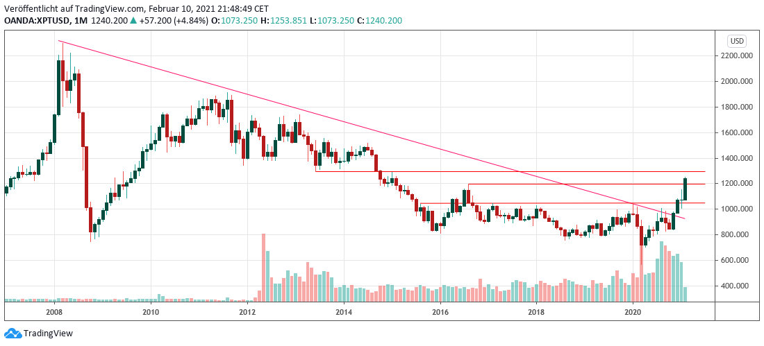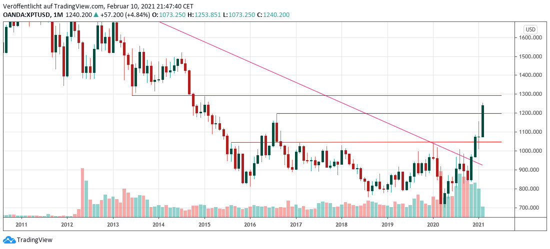 Damit wird die Chartluft zwar kurzfristig dünn, aber was heißt dies schon nach so einer langen Durststrecke, dem extrem kleinen physischen Markt und den immer helleren Aussichten? Deshalb würde ein schneller Test der nächsten Widerstandszone bei 1.300 Dollar nicht überraschen.