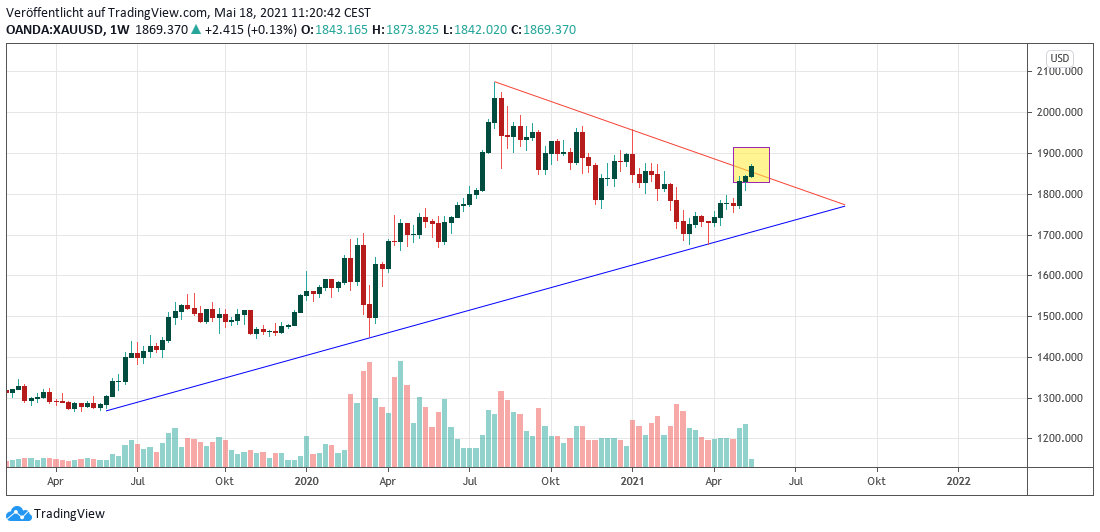 Ein erstes Signal hatte der Goldpreis bereits gegeben, als er an seinem 50 % - Fibonacci-Retracement sein Korrekturtief markierte. Im Ergebnis bleibt ein Konsolidierungskeil, aus dem Gold nun auszubrechen scheint.